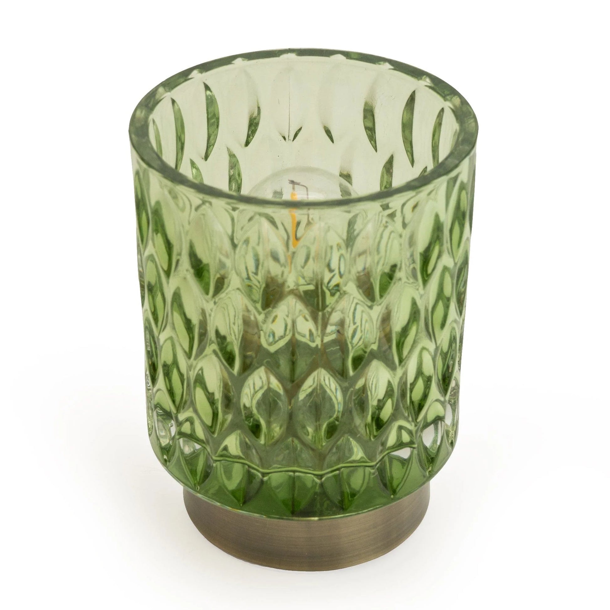 No Plug socket? No problem! Our unique green glass battery operated LED lamp in an cylindrical design with embossed feel. Ideal for the home or to take into the garden in the evening. Requires 2 x AAA batteries, not included.